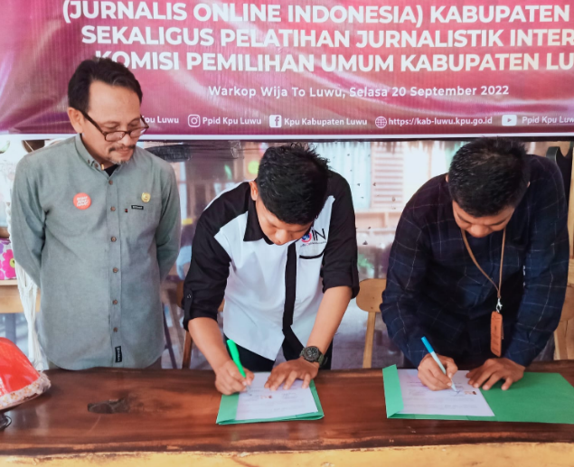 LUWU, LAYARNEWS.ID — Komisi Pemilihan Umum (KPU) Luwu menandatangani Memorandum of Understanding (MoU) dengan organisasi kewartawanan, Jurnalis Online Indonesia (JOIN) Kabupaten Luwu, di Warkop Wija To Luwu, Selasa, (20/9/2022).