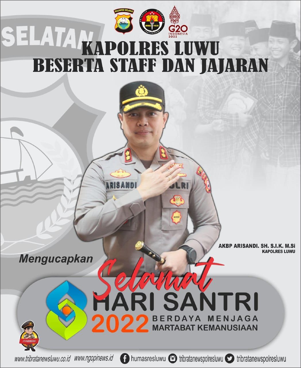 Kapolres Luwu AKBP Arisandi, SH, S.I.K, M.Si mengucapkan selamat Hari Santri Nasional 22 Oktober 2022, “Berdaya Menjaga Martabat Kemanusiaan”.