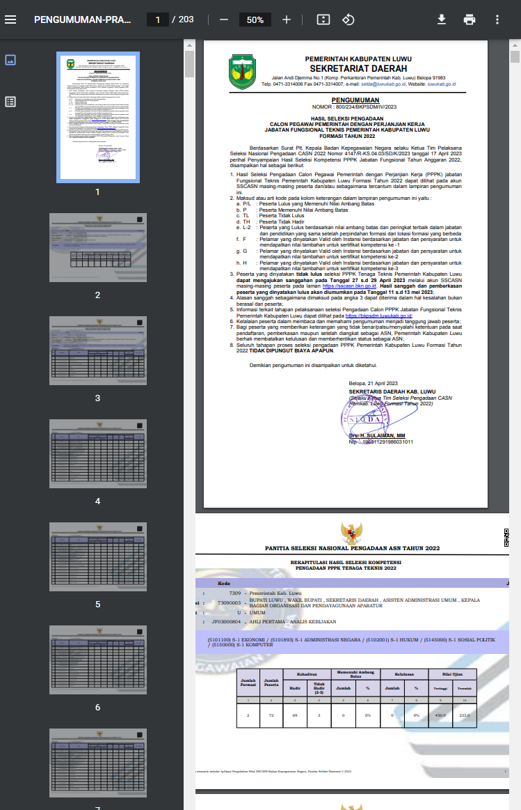 Hal Itu Tertuang dalam Pengumuman NOMOR : 800/234/BKPSDM/IV/2023 Hasil Seleksi Pengadaan Calon Pegawai Pemerintah Dengan Perjanjian Kerja Jabatan Fungsional Teknis Pemerintah Kabupaten Luwu Formasi Tahun 2022.