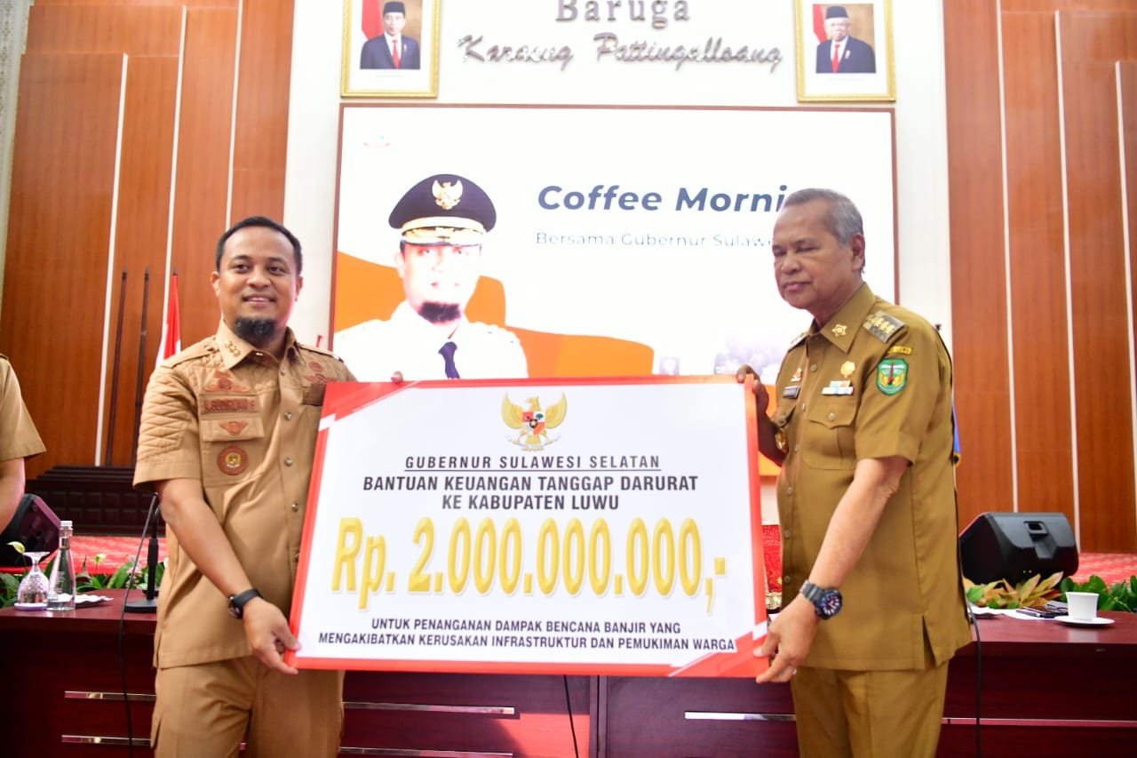 Bantuan Keuangan Tanggap Darurat di serahkan langsung oleh Gubernur Sulawesi Selatan, H Andi Sudirman Sulaiman kepada Bupati Luwu di Baruga Patingalloang Rujab Gubernur Sulsel, Makassar, Selasa (23/5/2023)