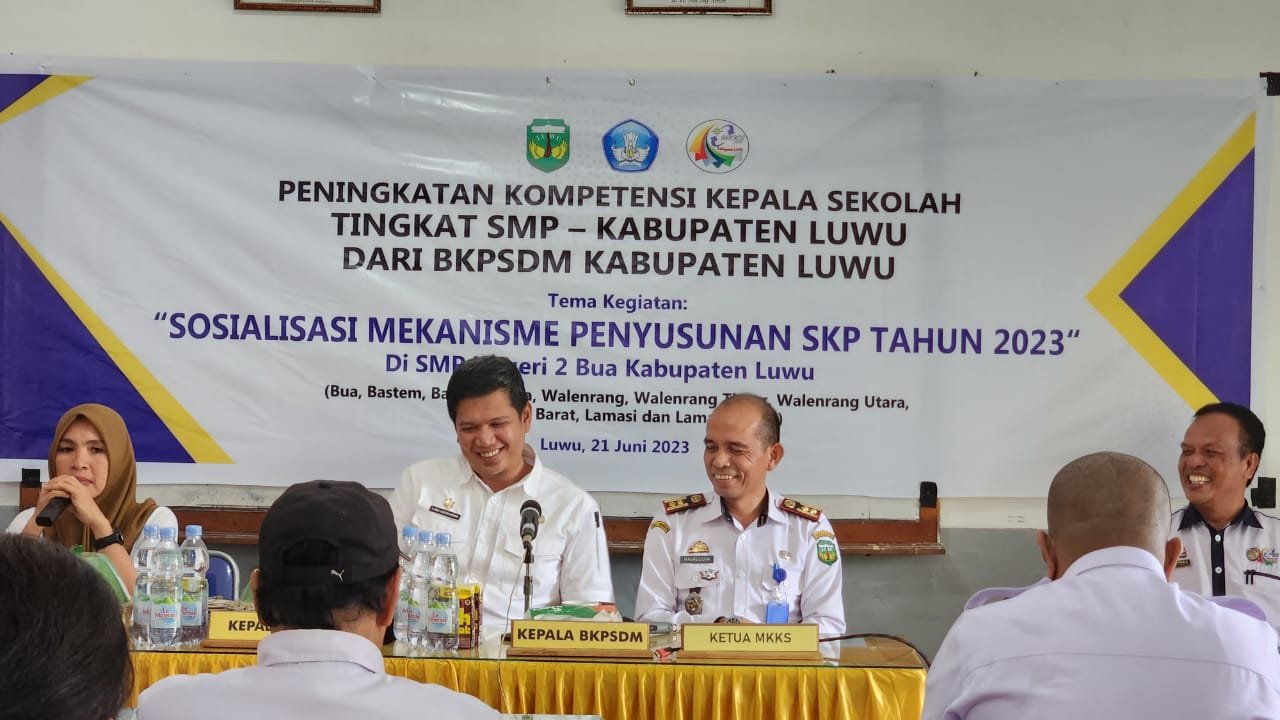 LUWU, LAYARNEWS.ID — Dalam rangka peningkatan kompetensi kepala sekolah Dinas Pendidikan dan Kebudayaan bekerja sama dengan Badan kepegawaian dan Pengembangan Sumber Daya Manusia (BKPSDM) mengadakan sosialisasi penyusunan Sasaran Kerja Pegawai (SKP) 21/06/2023.Kegiatan sosialisasi ini di bagi menjadi dua wilayah, Untuk Wilayah pertama di SMP Negeri 3 Belopa meliputi Kecamatan Larompong, Larompong Selatan, Suli, Suli Barat, Belopa, Belopa Utara, Bajo, Bajo Barat, Ponrang, Bua Ponrang, Ponrang Selatan, Kamanre dan Latimojong.