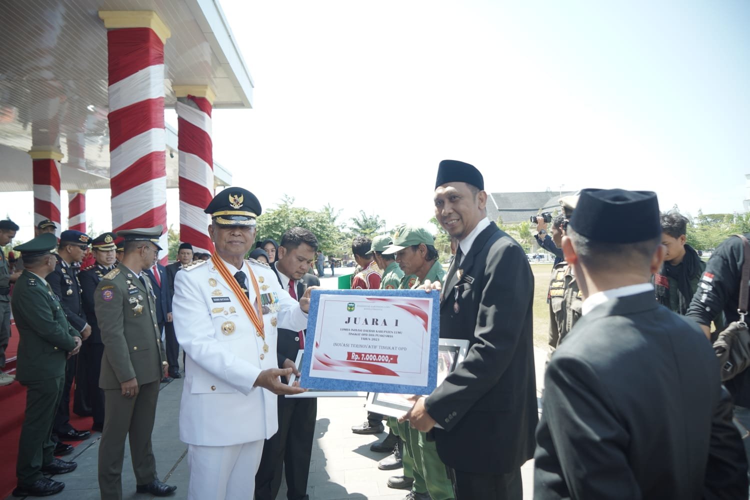 LUWU, LAYARNEWS.ID – Bupati Luwu, Dr. Drs. H Basmin Mattayang, MPd menyerahkan piagam penghargaan dan hadiah kepada pemenang lomba inovasi daerah antar Organisasi Perangkat Daerah (OPD) dan Puskesmas se Kabupaten Luwu tahun 2023, usai melaksanakan upacara peringatan detik-detik proklamasi dalam rangka Hari Ulang Tahun (HUT) ke-78 Kemerdekaan Republik Indonesia yang dilaksanakan di lapangan Andi Djemma Kelurahan Senga Kecamatan Belopa pada Kamis (17/8/2023).