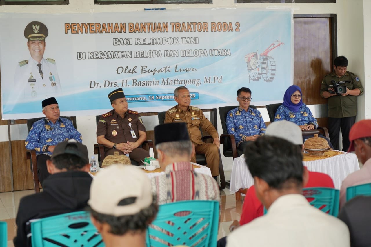 Penyerahan bantuan Handtraktor kepada petani dilakukan secara bertahap, di mana Bupati Luwu, Dr. Drs. H. Basmin Mattayang, MPd menyerahkan langsung mesin pertanian tersebut kepada kelompok tani sebagaimana dilaksanakan di Rujab Bupati Luwu, Kelurahan Pammanu Kecamatan Belopa Utara Senin (18/9/2023)