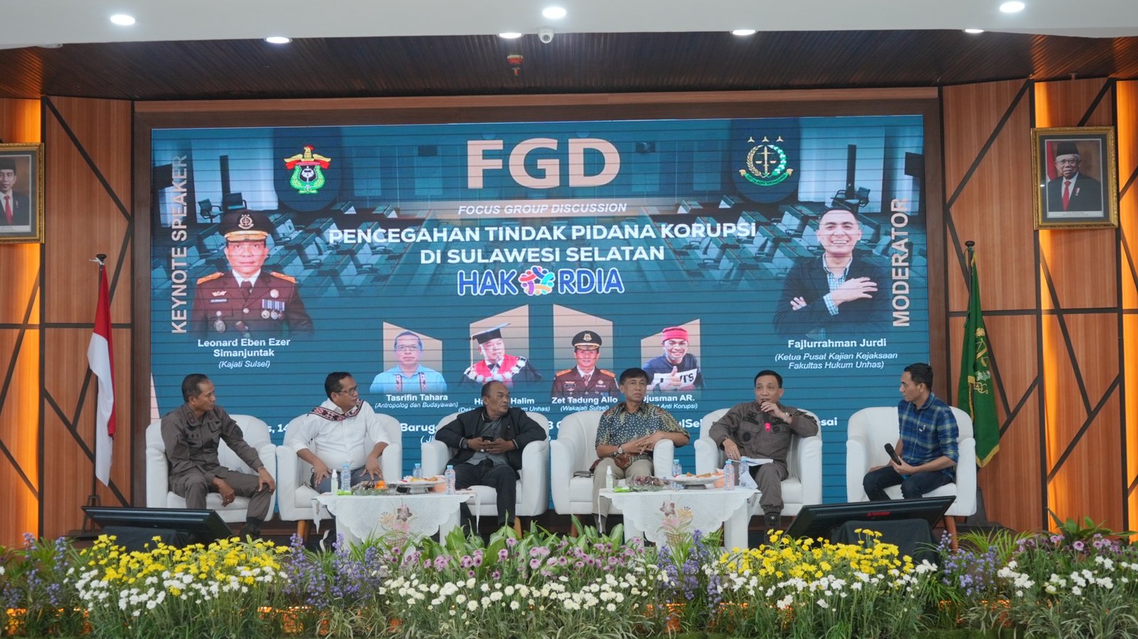 Adapun pembicara atau narasumber FGD yaitu Wakajati SulSel Zet Tadung Allo, SH.MH, Kepala Departemen Antropologi Fakakultas Ilmu Sosial Ilmu Politik Universsitas Hasanuddin Tasrifin Tahara, Prof. Irwansyah dan Bang Djusman AR (Penggiat Anti Korupsi di Sulawesi Selatan). Moderator pada Kegiatan Forum Grup Discussion (FGD) Fajlurrahman Jurdi (Ketua Pusat Kajian Kejaksaan Unhas).