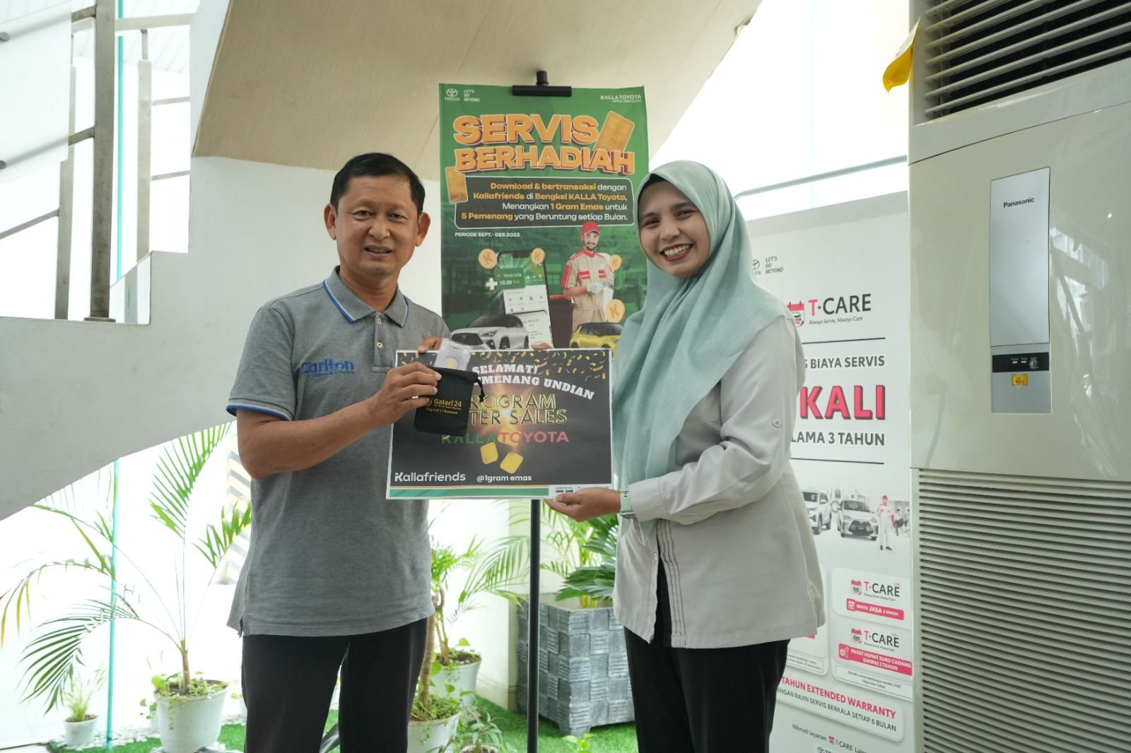 Kalla Toyota memberikan hadiah iPhone 15 kepada pelanggan yang telah membeli Toyota dan memberikan hadiah emas kepada pelanggan yang rutin melakukan servis di bengkel resmi Kalla Toyota.