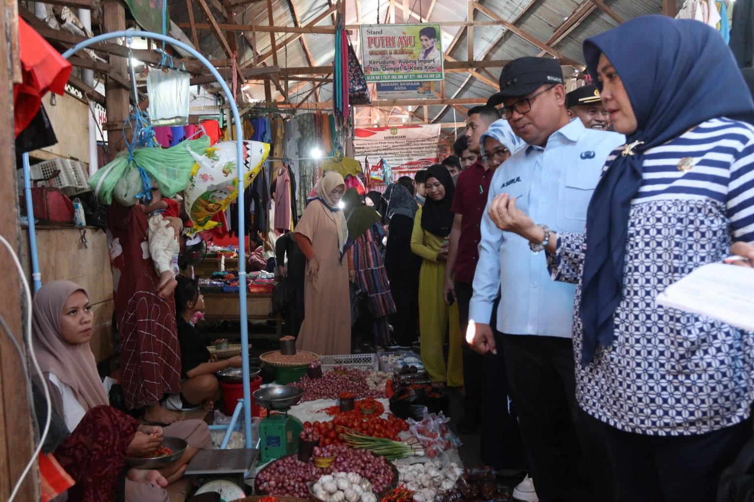 Pj. Wali Kota Palopo, Asrul Sani, S.H., M.Si., turun langsung melakukan operasi pasar pemantauan harga pokok jelang lebaran di Pusat Niaga Palopo pada, Jumat (05/04/2024).