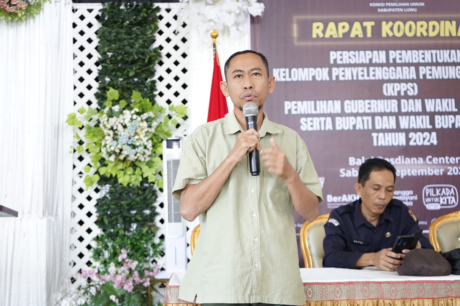 Dalam tahapan pembentukan KPPS, KPU Kabupaten Luwu melaksanakan Rapat Koordinasi (Rakor) Persiapan Pembentukan Kelompok Penyelenggara Pemungutan Suara (KPPS) Pemilihan Gubernur dan wakil Gubernur, Serta Bupati dan Wakil Bupati Luwu Tahun 2024, di Gedung BRC Belopa, Sabtu, 14 September 2024. Rakor itu diikuti PPK dan PPS se Kabupaten Luwu.