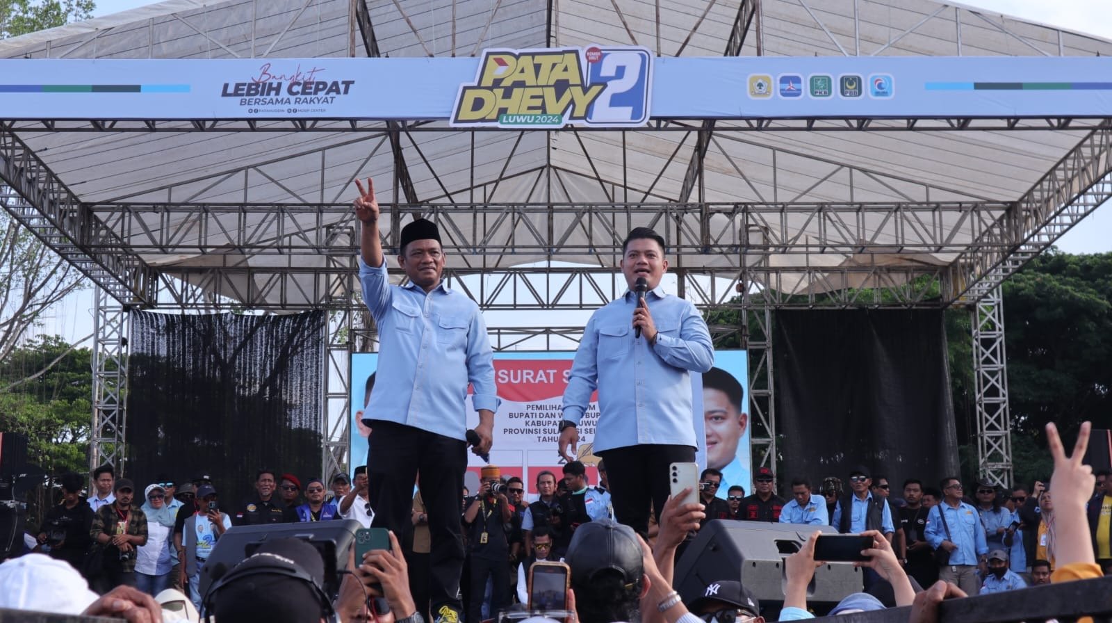 LUWU-Kampanye akbar pasangan calon bupati dan wakil bupati Luwu nomor urut 2, Patahuddin – Muhammad Dhevy Bijak Pawindu (Pata-Dhevy) digelar di Lapangan Andi Djemma Belopa, Kamis (21/11/2024) sore.